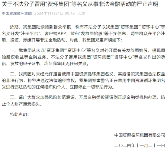 近期,中国资源轮回集团赓续接到巨匠举报,称有犯警分子以“资环集团”“资环中心”等模式树立“注册平台”、客户端App,溜达“披发原始股”等伪善信息,相似巨匠在平台注册、投资,涉嫌开展罪人金融动作。对此,11月21日,“中国资源轮回集团”微信公众号发布流露声明。